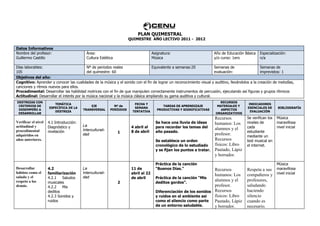 El plan quimestral presenta los objetivos, temas, actividades y evaluaciones para la asignatura de Música del primer año de Educación Básica. Los objetivos cognitivos, procedimentales y actitudinales buscan que los estudiantes aprendan sobre la música y desarrollen habilidades motrices y de apreciación cultural. El plan contiene 6 temáticas con actividades como cantar canciones, reconocer sonidos del ambiente, instrumentos musicales y partituras. Las evaluaciones verifican el nivel actitudinal y conocimientos adquiridos.