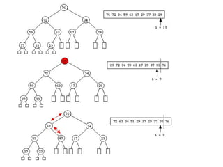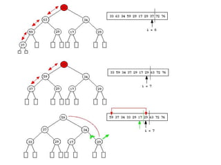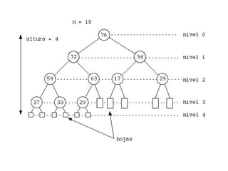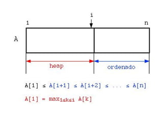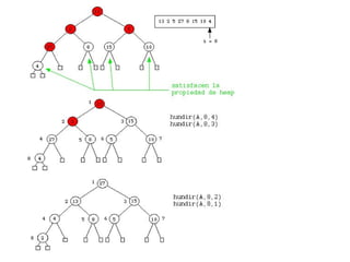 1) El documento describe los montículos (heaps) y el algoritmo de ordenamiento heapsort. 2) Un montículo es un árbol binario que cumple tres propiedades relacionadas con el orden de los elementos almacenados. 3) Heapsort ordena un vector construyendo primero un montículo con sus elementos y luego extrayendo los elementos de mayor a menor prioridad para colocarlos en su posición final.