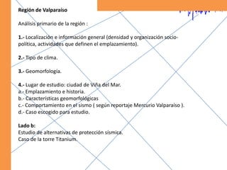 El documento describe la región de Valparaíso en Chile, incluyendo su ubicación, clima, geomorfología y un caso de estudio de la ciudad de Viña del Mar. Examina el comportamiento sísmico de Viña del Mar durante un terremoto reciente y estudia alternativas para proteger edificios contra sismos, como el aislamiento sísmico de base.