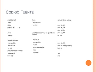 Este programa en lenguaje ensamblador lee 10 caracteres sin eco y los almacena en una cadena, luego posiciona el cursor y imprime la cadena en la pantalla.