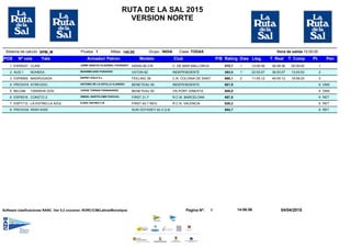 Este documento presenta los resultados de la primera prueba de la Ruta de la Sal 2015. Muestra el orden de llegada de 8 barcos participantes indicando su número, nombre, tiempo de llegada, penalizaciones y puntos obtenidos. El barco ESP6237 llegó en primer lugar con un tiempo de 26:09:36 y obtuvo 570,7 puntos.