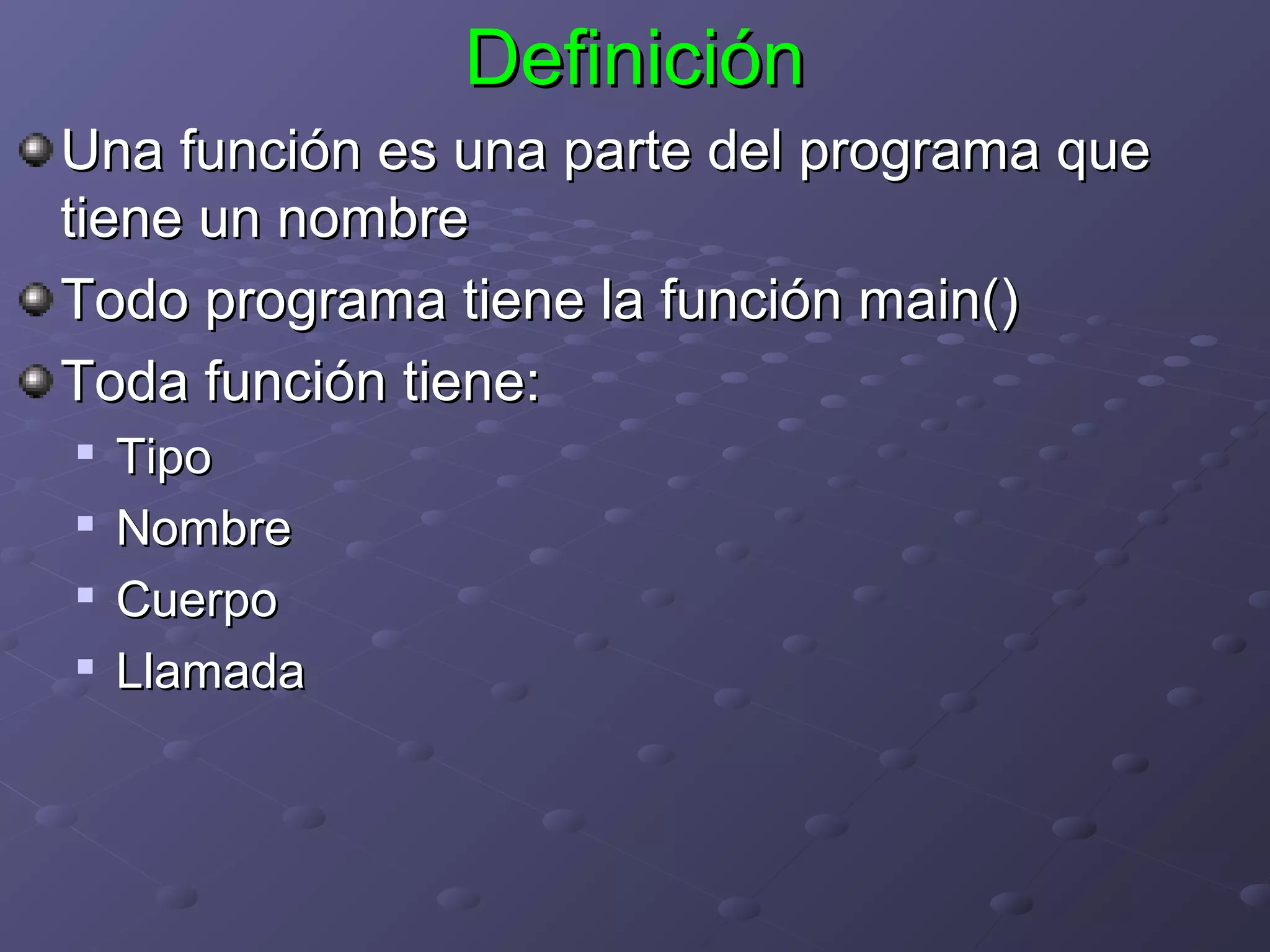 Este documento describe las funciones en el lenguaje C. Explica que una función tiene un tipo, nombre y cuerpo. También tiene una llamada. El tipo indica qué información devuelve la función. El nombre identifica la función. El cuerpo contiene el código de la función. La llamada ejecuta la función.