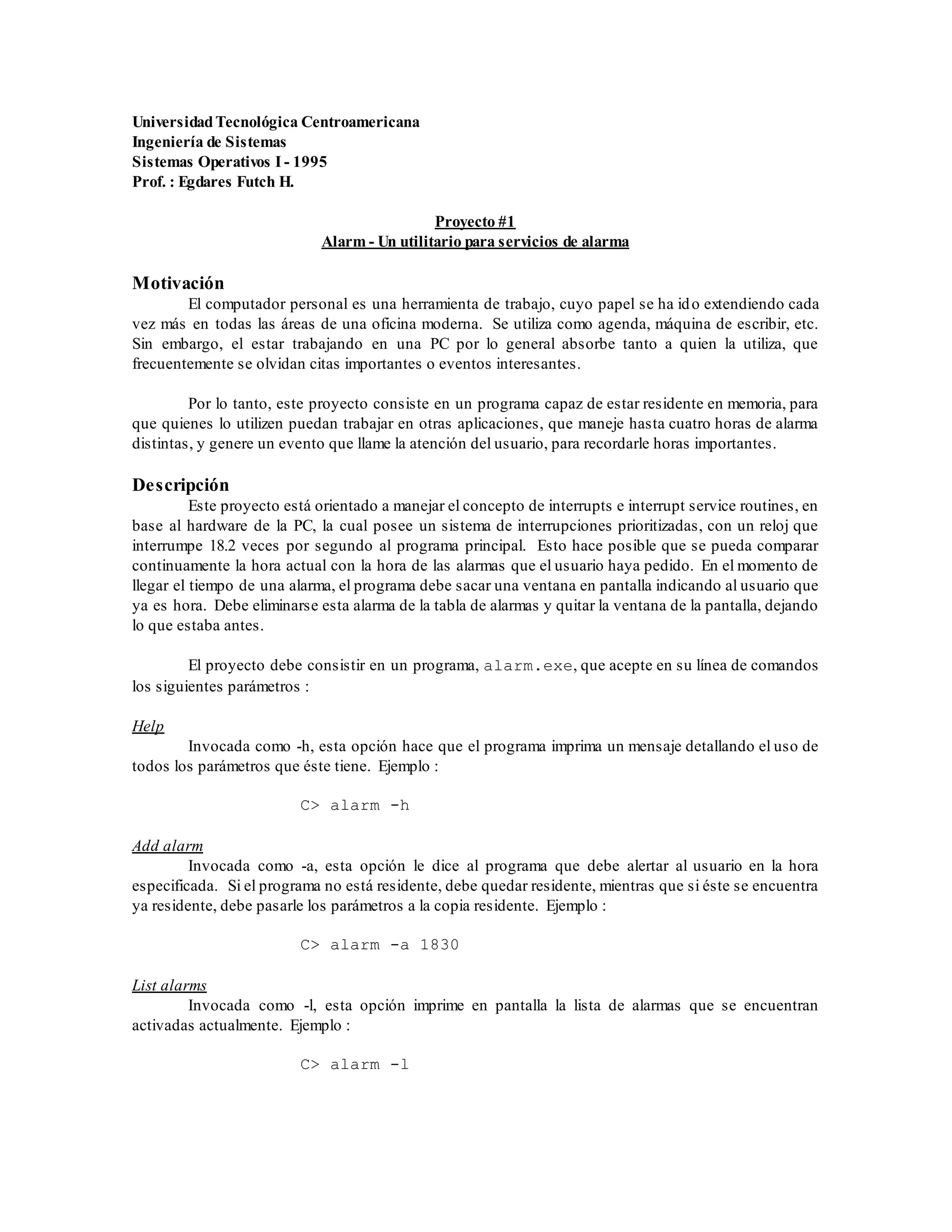 Este proyecto consiste en un programa llamado alarm.exe que puede agregar, listar y eliminar hasta 4 alarmas para recordar eventos importantes al usuario. El programa debe instalarse de forma residente en la memoria para que pueda alertar al usuario aún cuando está usando otras aplicaciones. Al llegar la hora de una alarma, el programa debe mostrar una ventana indicando la alarma y luego eliminarla de la tabla. El programa debe leer directamente el contador de tiempo del BIOS para obtener la hora actual en lugar de usar la función GetTime() de MS-DOS.