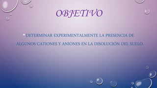 Este documento describe un experimento para identificar iones en una muestra de suelo. Se diluyó la muestra de suelo en agua y se midió el pH. Luego se añadió ácido nítrico y se filtró, obteniendo una disolución y un residuo sólido. Se realizaron pruebas en tubos de ensayo usando reactivos para identificar la presencia de cloruros, sulfatos, hierro y carbonatos. Los resultados mostraron la presencia de cloruros y carbonatos, pero no de sulfatos ni potasio.