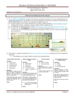 Este documento presenta dos prácticas extraescolares para crear tablas en Microsoft Word. La primera práctica implica crear un menú alimenticio para un asilo de ancianos y la segunda, convertir recetas de bebidas energéticas en una tabla. También incluye crear un horario de clases con actividades extraescolares en una segunda tabla.