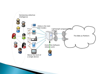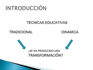 El documento discute las diferencias entre las técnicas educativas tradicionales y dinámicas, y examina si ha ocurrido una transformación. También explora cómo surgió Internet, qué es, para qué sirve e implicaciones. Finalmente, analiza las diferencias entre la Web 1.0 y la Web 2.0, y cómo Internet puede usarse como biblioteca, imprenta, canal de comunicación y herramienta de narración.