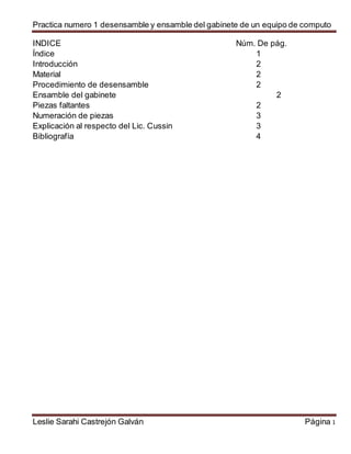 La práctica consistió en desmontar y volver a montar el gabinete de un equipo de computo. Se describen los pasos para desmontarlo, incluyendo retirar la fuente de poder, cables, tarjeta madre y demás componentes. También se explica el proceso de volver a montarlo colocando cada pieza en su lugar correcto. Finalmente, se enumeran las piezas y se incluye una breve explicación del profesor sobre diferentes componentes de la tarjeta madre.