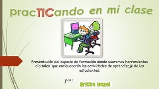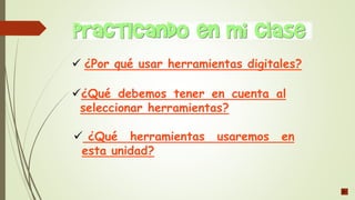 Este documento presenta las herramientas digitales que se usarán para enriquecer las actividades de aprendizaje de los estudiantes. Explica las razones para usar herramientas digitales, como la ubicuidad y la posibilidad de aprender a profundidad y de manera colaborativa. Luego, detalla algunos criterios para seleccionar herramientas, como la funcionalidad, simplicidad y gratuidad. Finalmente, menciona cuatro herramientas específicas que se usarán: mapas conceptuales, edición de videos, cómics y