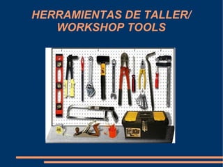 El documento describe cuatro herramientas de taller comunes: una sierra de arco para cortar metal y plástico, un martillo para clavar, un destornillador para atornillar y desatornillar tornillos, y unos alicates para cortar cables. Cada herramienta se define por su nombre en inglés, la familia a la que pertenece, los materiales que trabaja y sus características principales.