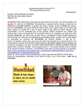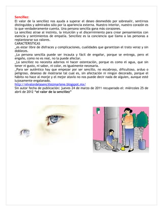 Este documento presenta tres valores fundamentales: la humildad, la sencillez y la amistad. Describe la humildad como reconocer las capacidades de los demás y no abusar del poder. Explica que la sencillez atrae a las personas de manera genuina y las lleva a replantear sus valores. Finalmente, define la amistad como un vínculo recíproco que permite compartir experiencias y apoyarse mutuamente en los momentos felices y difíciles.
