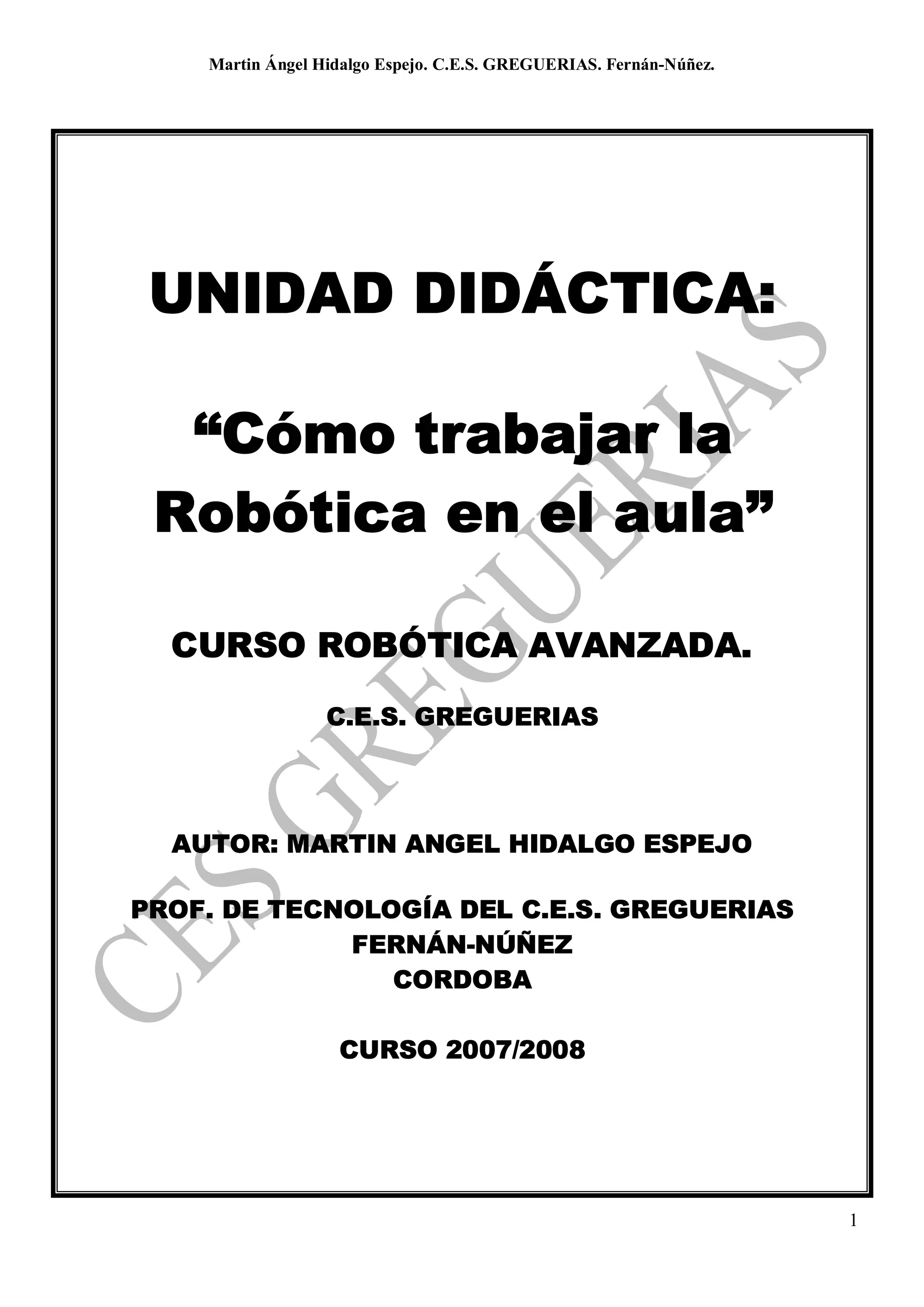 Este documento presenta una unidad didáctica sobre robótica dirigida a estudiantes de 2o y 3o de ESO. La unidad contiene 18 sesiones diseñadas para explicar conceptos básicos de robótica como la diferencia entre máquina, máquina automática y robot, partes de un robot, sensores y actuadores, y programación básica. El documento incluye objetivos, contenidos, metodología, actividades, recursos y criterios de evaluación. La unidad utiliza kits Lego Mindstorms para que los estudiantes construyan y program