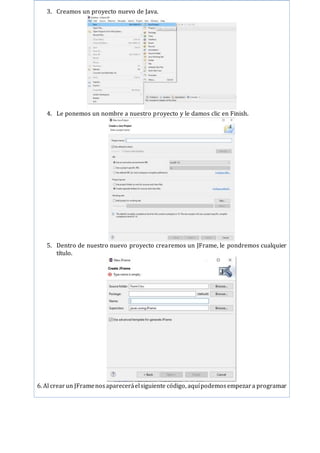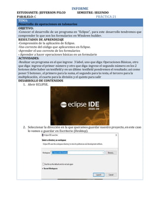 El documento describe el desarrollo de un programa en Eclipse para realizar operaciones básicas como suma, resta, multiplicación y división. El programa incluye labels, textfields y botones para ingresar dos números y mostrar el resultado de la operación seleccionada. El documento explica paso a paso cómo crear el proyecto en Eclipse, agregar los componentes de interfaz, y escribir el código para cada botón de operación.