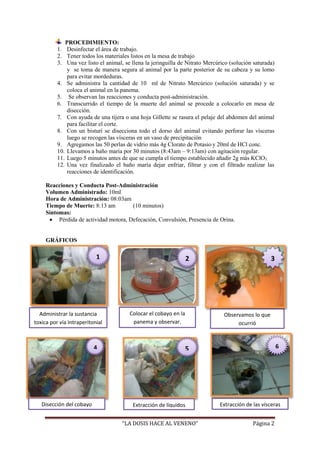 La práctica evaluó los efectos de la intoxicación por mercurio en cobayos. Se administró nitrato de mercurio a un cobayo vía intraperitoneal. El cobayo murió en 10 minutos mostrando pérdida de movilidad, convulsiones y orina. Se identificó mercurio en las vísceras a través de pruebas químicas. La conclusión fue que el mercurio es altamente tóxico y puede causar la muerte cuando se inhala o ingiere.