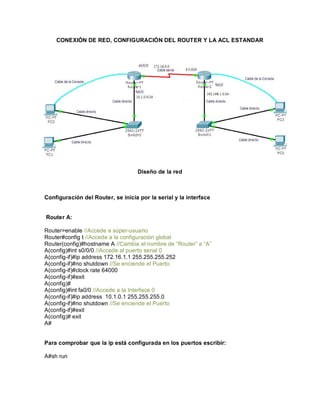 Este documento describe la configuración de una red entre dos routers conectados por una interfaz serial. Se configuran las interfaces seriales y Ethernet de cada router con direcciones IP y se habilita el protocolo RIP. También se configura una ACL en el Router A para denegar el acceso de una computadora específica a la red externa mientras se permite el acceso al resto de hosts.
