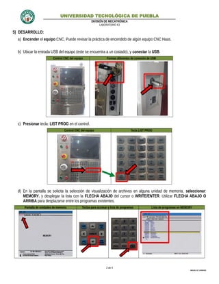 Este documento describe los pasos para copiar programas del control CNC Haas a una memoria USB externa. Estos pasos incluyen encender el equipo CNC, conectar una memoria USB, seleccionar el programa a copiar desde la lista de programas en la memoria del control, copiar el programa seleccionado a la USB, y confirmar que el programa se copió correctamente a la memoria USB. El objetivo es que los estudiantes aprendan a transferir programas del control CNC a un dispositivo externo para su revisión y edición fuera de la má