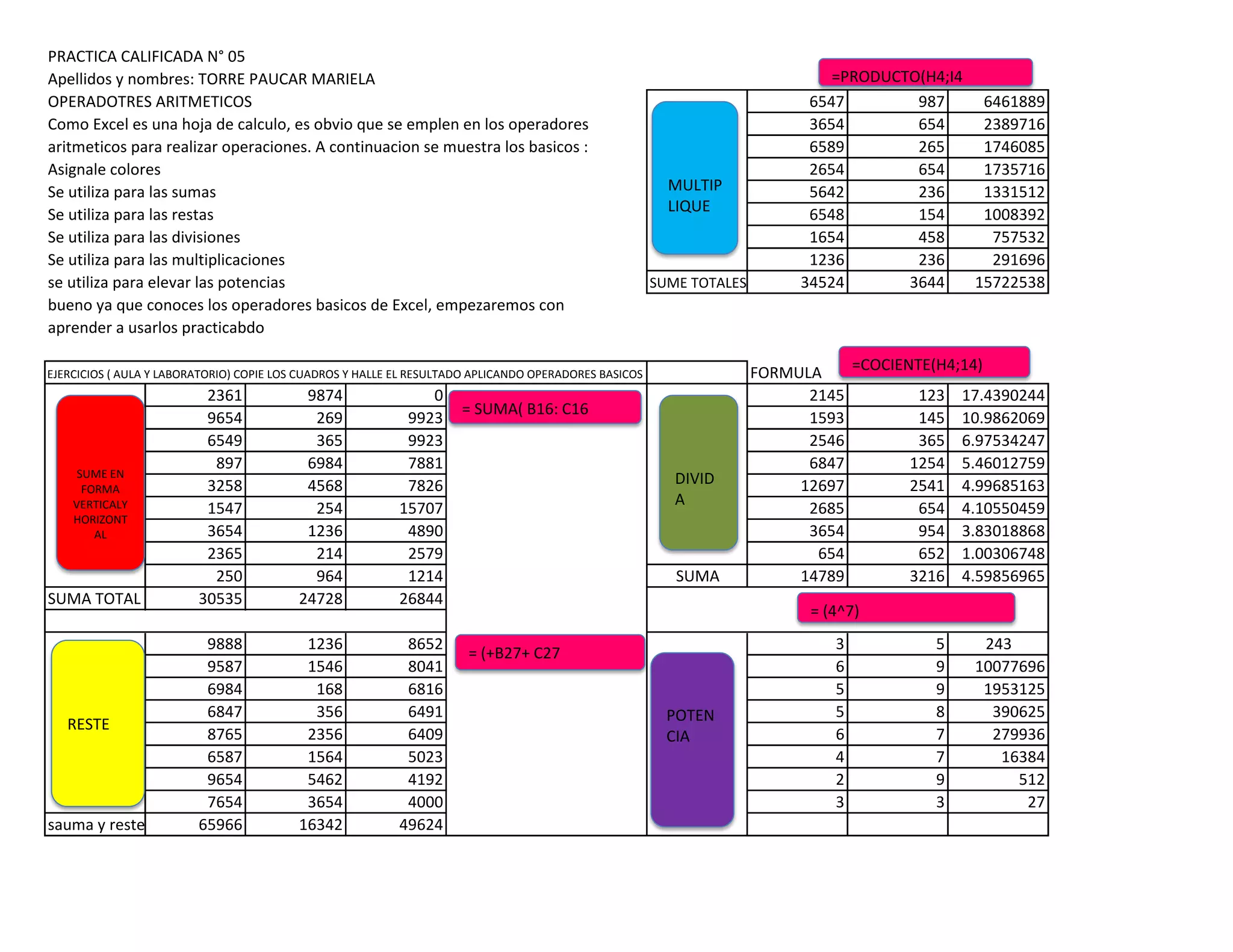 Este documento proporciona una introducción a los operadores aritméticos básicos en Excel como la suma, resta, multiplicación y división. Explica cómo se usan estos operadores y presenta ejemplos numéricos para practicar realizando cálculos usando las fórmulas de Excel. El documento concluye con una tabla resumen de ejercicios para que el lector practique usando los operadores aritméticos en Excel.