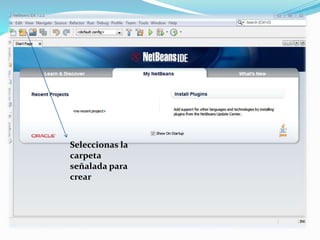 El documento describe los pasos iniciales para crear un proyecto de programación. Selecciona la carpeta indicada y luego nombra el nuevo proyecto.