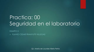 Este documento presenta la práctica de seguridad en el laboratorio realizada por el equipo 5. Incluye los nombres de los integrantes del equipo, un diagrama de bloques del laboratorio y preguntas sobre extintores, hojas de manejo de reactivos y medidas de seguridad en el laboratorio, manejo de reactivos y vestimenta de seguridad.