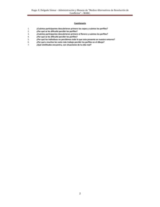 El documento describe un ejercicio práctico que examina las limitaciones en la percepción de los individuos mediante la observación de dos dibujos: un copero y un florero. Los participantes realizan descripciones individuales y luego se integran en grupos para analizar y comparar sus respuestas. Además, se plantea un cuestionario para profundizar en las dificultades de percepción y su relación con situaciones de la vida real.