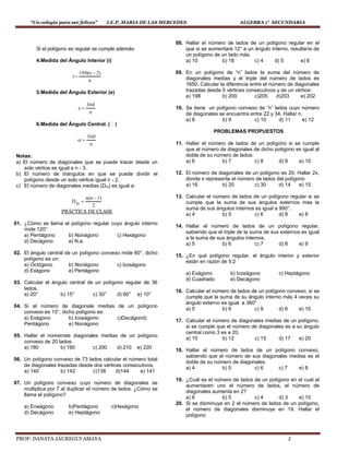 Este documento proporciona una introducción a los polígonos, incluidas sus definiciones, elementos, clasificaciones y propiedades. Explica que un polígono es una figura plana delimitada por lados y vértices. Define y da ejemplos de polígonos convexos, cóncavos, regulares, equiángulos y equiláteros. Además, establece fórmulas para calcular la suma de ángulos internos y externos, el número de diagonales y otras propiedades para diferentes tipos de polígonos. Finaliza con una sección de