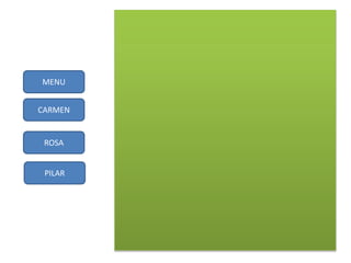 Este documento presenta un menú con los nombres Carmen, Rosa y Pilar, así como secciones para expresar cómo se siente el autor y rescatar información de un video.