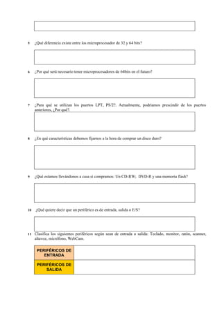 Este documento proporciona una lista de preguntas sobre los componentes fundamentales de un ordenador, incluyendo hardware como el teclado, monitor y microprocesador, y software como sistemas operativos y aplicaciones. Las preguntas cubren temas como la diferencia entre hardware y software, los componentes internos de la torre como la CPU y disco duro, periféricos de entrada y salida, y características de sistemas operativos como Windows y Linux.