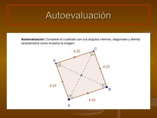 El documento describe los pasos para construir un cuadrado usando la herramienta de polígono regular en el software GeoGebra. Primero se dibujan los puntos A y B y luego se selecciona la opción de polígono regular. Al digitar 4 vertices aparece un cuadrado. A continuación, se explican los pasos para realizar la autoevaluación marcando puntos, ángulos, diagonales y medidas.