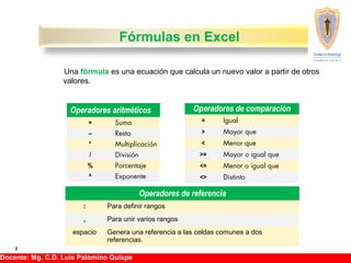 El documento describe las funciones y fórmulas en Excel, incluyendo operadores aritméticos, de comparación y de referencia. Explica los tipos de referencias, funciones predefinidas y cómo crear funciones mediante el uso de la función SI.