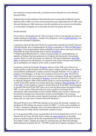 Microsoft Word es un software de procesamiento de texto creado por Microsoft. Originalmente desarrollado en 1983 para IBM DOS, ahora viene integrado en Microsoft Office. Tuvo dificultades iniciales para ganar popularidad, pero despegó con las versiones para Windows en 1989 y 1990. Actualmente es el líder del mercado con 500 millones de usuarios, aunque otras opciones en línea y de código abierto están ganando terreno.
