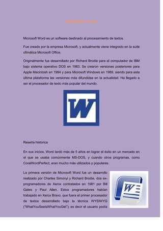 Este documento proporciona una reseña histórica de Microsoft Word. Comenzó siendo desarrollado en 1983 y se ha convertido en el procesador de texto más popular del mundo. Ha pasado por varias versiones para diferentes sistemas operativos como MS-DOS, Windows y Macintosh. Actualmente es el líder absoluto en el mercado de procesadores de texto.