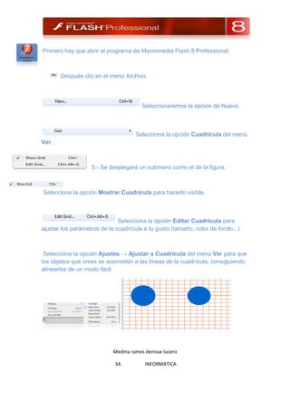 El documento proporciona instrucciones en 7 pasos para configurar la cuadrícula en Macromedia Flash 8 Professional, incluyendo abrir el programa, seleccionar Nuevo en el menú Archivo, mostrar la cuadrícula en el menú Ver, editar la cuadrícula para ajustar el tamaño y color, y ajustar los objetos creados a la cuadrícula para alinearlos fácilmente.