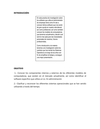 Este documento presenta un resumen de una práctica de informática para la administración. El objetivo es conocer los componentes de las computadoras y el software utilizado por los administradores. Se describen los resultados de investigar diferentes modelos de computadoras, sistemas operativos a través del tiempo, y software de administración. Se concluye que los sistemas operativos y computadoras han evolucionado para satisfacer las necesidades de los usuarios, y el administrador se beneficia del conocimiento informático y software disponible.