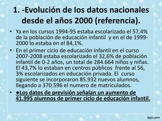 Este documento analiza la educación infantil en España y Castilla-La Mancha desde 2000 hasta 2020. Muestra que la escolarización infantil en España ha aumentado significativamente desde 2000 y supera los promedios de la UE y la OCDE. Además, la educación infantil temprana se asocia con mejores resultados educativos. Castilla-La Mancha tiene altas tasas de escolarización, especialmente en Toledo, aunque Cuenca tiene las tasas más bajas.