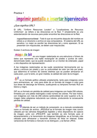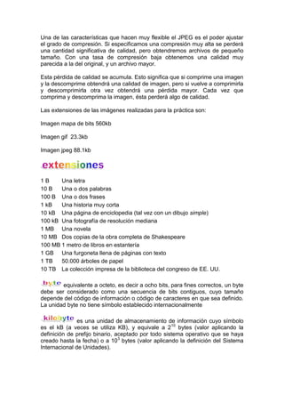 El documento explica los conceptos de URL, formatos de imágenes (GIF, JPEG), unidades de medida de almacenamiento (byte, kilobyte, megabyte, gigabyte, terabyte) y las diferencias entre las definiciones binarias y decimales de estas unidades. También describe las características y usos de los formatos de imágenes GIF y JPEG y cómo la compresión JPEG causa pérdida acumulativa de calidad.