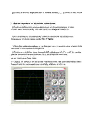 Este documento describe una práctica de visualización de formas de onda en un osciloscopio utilizando el simulador Proteus. Se piden varios ejercicios para visualizar señales de corriente continua, alterna y cuadrada mediante la conexión de fuentes de alimentación, alternadores y generadores de pulsos a un osciloscopio virtual y ajustar sus controles para obtener mediciones.