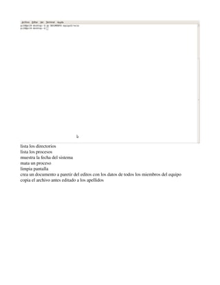 El documento instruye crear una estructura de directorios con el nombre del equipo como directorio raíz, subdirectorios con los nombres de los integrantes del equipo y subsubdirectorios con los apellidos de cada integrante. Luego crear un documento con datos generales de una persona y copiarlo al subsubdirectorio de apellidos de un integrante y moverlo al subdirectorio de otro integrante.