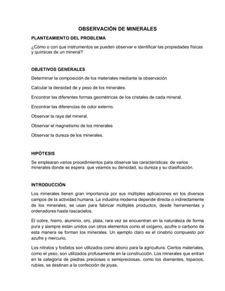 Este documento presenta una práctica sobre las propiedades físicas y químicas de los minerales. Los estudiantes observarán minerales utilizando un microscopio para identificar su composición, color, forma cristalina y otras características. Completarán tablas describiendo sus observaciones de cada mineral a simple vista y con microscopio. El documento también incluye información sobre la importancia de los minerales y la minería en México.