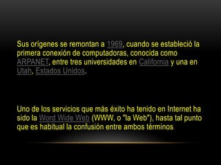 Internet es una red descentralizada de redes interconectadas que utiliza protocolos TCP/IP para funcionar como una red lógica global. Sus orígenes se remontan a 1969 con la conexión de computadoras entre universidades en EE.UU. Un servicio popular es la World Wide Web, desarrollada en 1990, que permite la consulta remota de archivos de hipertexto usando Internet. Existen otros servicios además de la Web, como correo electrónico, transferencia de archivos, conversaciones en línea y contenido multimedia.