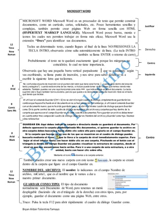 Microsoft Word es un procesador de texto que permite crear documentos como currículos y cartas, utilizando herramientas sencillas y complejas. Utiliza la extensión 'docx' y permite el guardado de documentos a través de una interfaz que muestra carpetas y archivos. Asimismo, incluye características como el punto de inserción y la opción de guardar documentos como diferentes tipos de archivos.