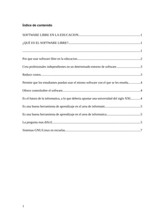 Este documento discute los beneficios del uso de software libre en la educación. Argumenta que el software libre permite compartir el conocimiento humano de manera gratuita y equitativa, reduce los costos para las instituciones educativas, y permite a los estudiantes aprender tecnologías de código abierto que son ampliamente utilizadas. También señala que el software libre ofrece control total sobre el software y es una buena herramienta para el aprendizaje práctico de programación.