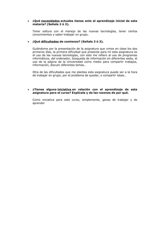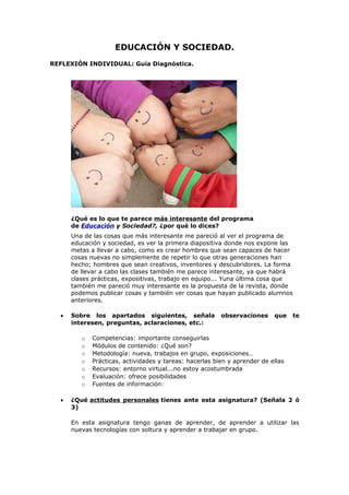 El documento presenta las reflexiones de un estudiante sobre el programa de educación y sociedad. El estudiante encuentra más interesantes los objetivos de desarrollar la creatividad y la innovación, así como las clases prácticas y el trabajo en equipo. También le parece interesante la revista donde pueden publicar los estudiantes. El estudiante muestra ganas de aprender sobre nuevas tecnologías y trabajo en equipo, pero anticipa dificultades iniciales con las herramientas tecnológicas y el trabajo colaborativo.
