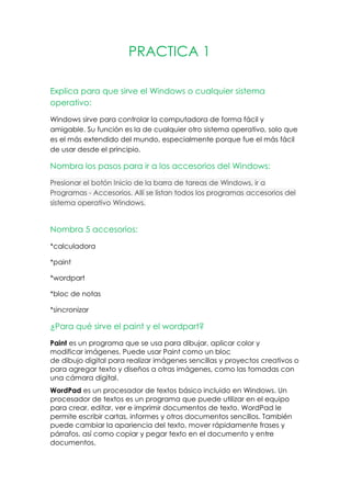 Windows es un sistema operativo ampliamente utilizado que facilita el control de la computadora de forma fácil y amigable. Incluye diversos accesorios como la calculadora, Paint y WordPad. Paint permite dibujar y editar imágenes mientras que WordPad es un procesador de texto básico. El usuario puede configurar la pantalla cambiando la resolución, colores y fondo de escritorio e instalar un protector de pantalla.