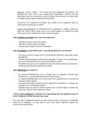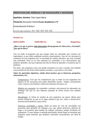 Este documento contiene la autoevaluación de una estudiante de Educación Infantil sobre la asignatura Educación y Sociedad. La estudiante considera que los contenidos y la metodología de la asignatura son adecuados para su formación, aunque cree que debería haber un mayor énfasis en la práctica sobre la teoría. También menciona algunas dificultades iniciales como la falta de tiempo y acceso a internet para completar todas las tareas.