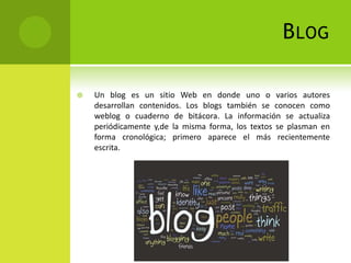 Un blog es un sitio web donde uno o más autores publican contenido de forma periódica en orden cronológico. Los lectores pueden comentar los artículos y participar en un diálogo. Existen diferentes tipos de blogs como personales, corporativos, por género (viajes, política), o por medio de comunicación utilizado (video, fotos).