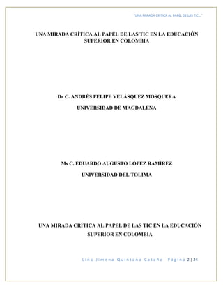 Este documento hace una reflexión crítica sobre el papel de las tecnologías de la información y la comunicación en la educación superior en Colombia. Analiza perspectivas de uso de las TIC, sus implicaciones en el aprendizaje y los retos para las universidades. Se discuten ideas sobre las TIC y su virtualización, e incluye temas como sociedad de la información, entornos virtuales de aprendizaje y formación de docentes.