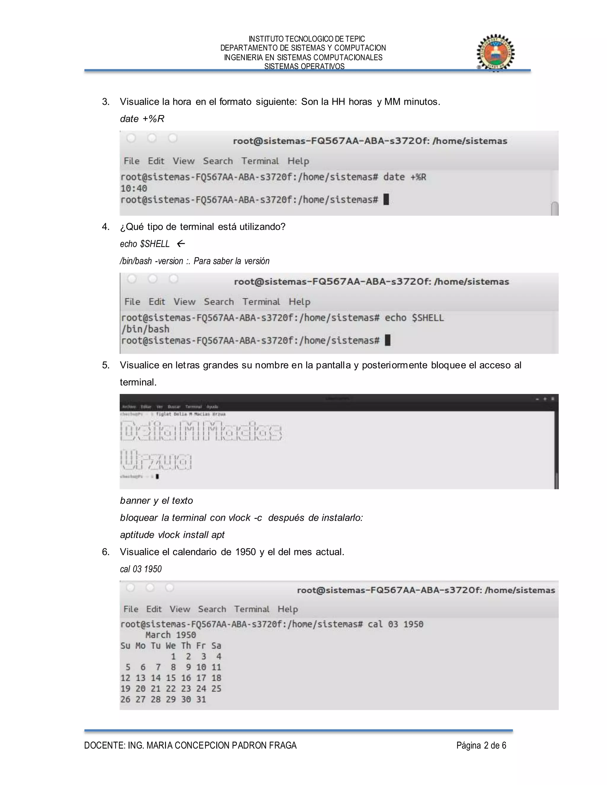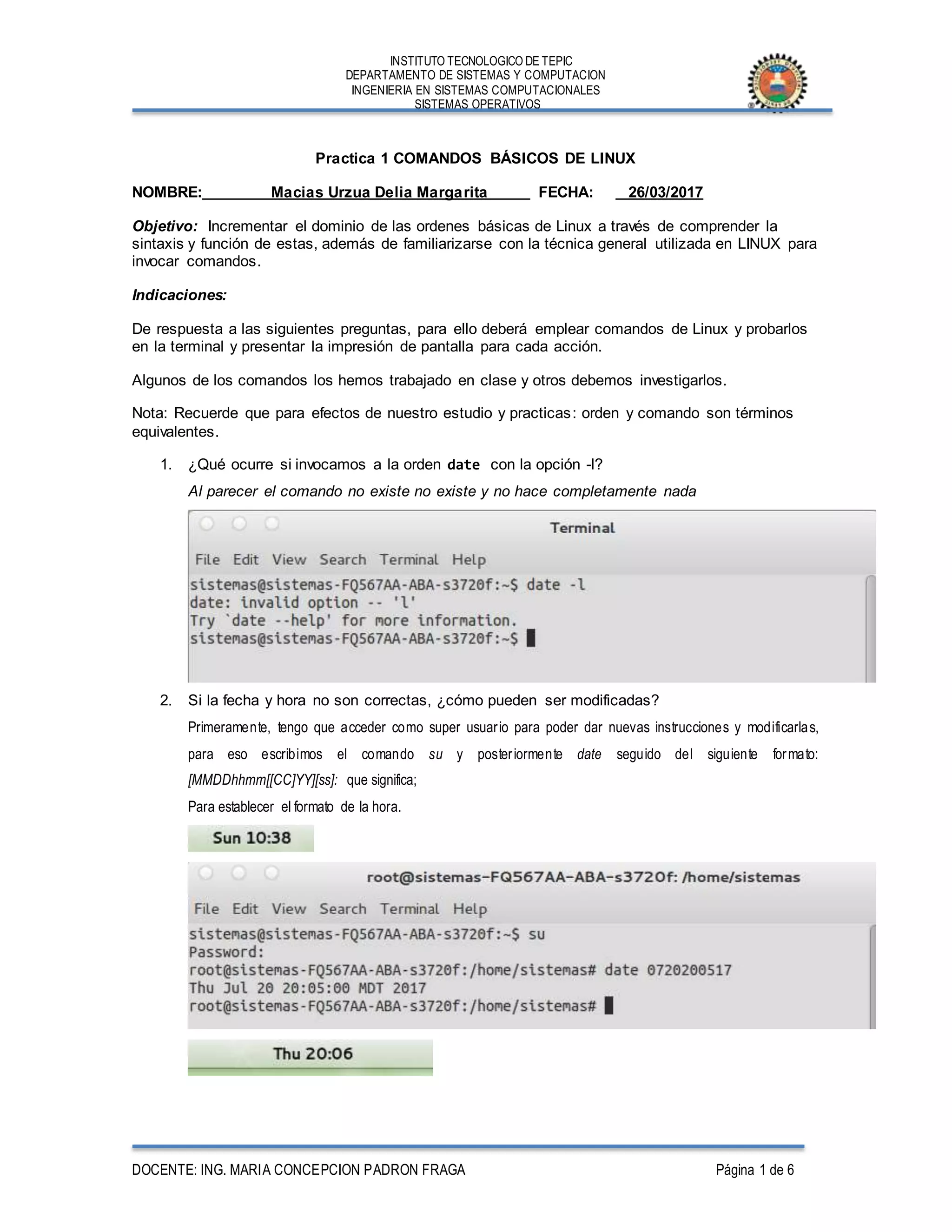 Este documento presenta una práctica sobre comandos básicos de Linux. Contiene 13 preguntas para que el estudiante realice usando comandos como date, cal, banner, uname, passwd, man y login. El objetivo es incrementar el dominio de las órdenes básicas de Linux y familiarizarse con su sintaxis y función.