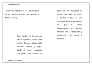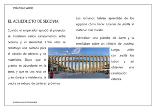 El documento describe cómo los romanos construyeron el acueducto de Segovia. Establecieron campamentos entre Segovia y el manantial para transportar obreros y materiales, como granito extraído de canteras cercanas. También aprendieron de los egipcios a hacer tuberías de arcilla enrolladas en cilindros de madera y unidas con arcilla, y a excavar túneles entre pozos cada 50 metros para recubrir las paredes con ladrillos o piedras unidas con cemento. Los romanos perfeccionaron la construcción de arcos