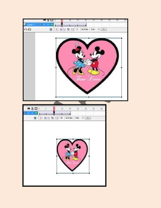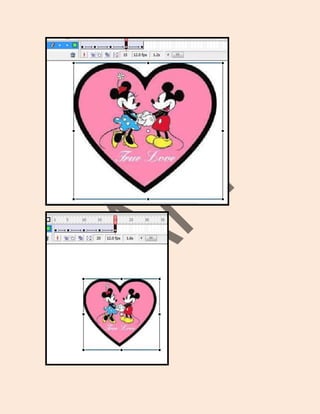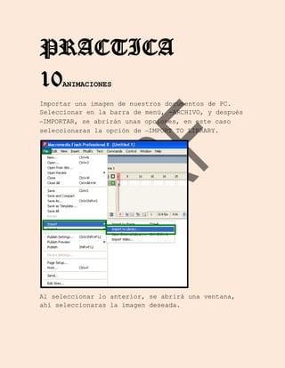 Este documento proporciona instrucciones para crear una animación básica de 10 fotogramas en Adobe Flash importando una imagen. Primero se importa la imagen y se arrastra al área de trabajo. Luego se insertan marcos clave en los fotogramas 5 y 10. Después se seleccionan todos los fotogramas y se crea una transición de movimiento. Finalmente, se modifica el tamaño de la imagen en cada fotograma usando la herramienta de transformación libre y se reproduce la animación.