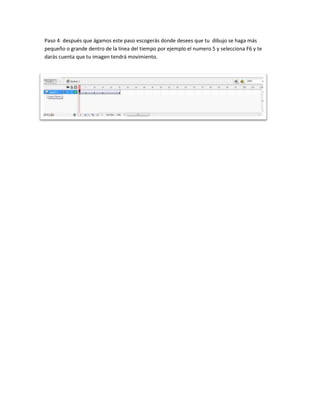 Este documento proporciona 4 pasos para crear una caricatura animada en un escenario digital. Primero, se dibuja la caricatura en el escenario. Luego, se selecciona la imagen y se usa la herramienta de selección libre. Después, al hacer clic secundario en la línea de tiempo se elige la opción de crear una interpolación de movimiento. Finalmente, al seleccionar un punto en la línea de tiempo y presionar F6, la imagen tendrá movimiento al hacerse más pequeña o más grande.