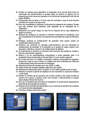 El documento describe los 35 pasos para instalar el sistema operativo Windows XP en una computadora, incluyendo particionar y formatear el disco duro, copiar los archivos de instalación, configurar la fecha, hora y zona horaria, crear cuentas de usuario, y finalizar la instalación. El proceso guía al usuario a través de la configuración inicial del sistema operativo.